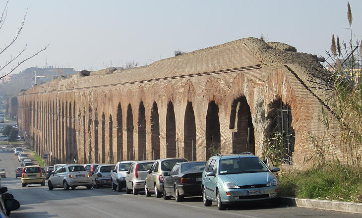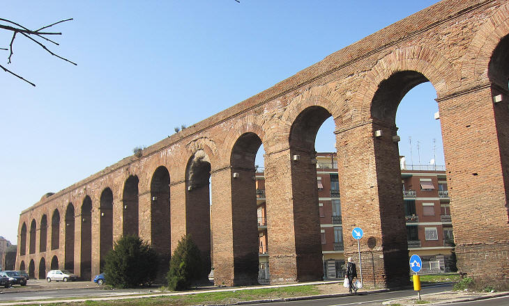 Aqueducts testify to the advanced construction techniques developed by Roman engineers; the movement of water was based on gravity and this meant that an appropriate gradient was required along the whole length of the aqueduct, the route of which was carefully planned in order to exploit as much as possible the shape of the ground; in the case of the aqueduct built by Emperor Alexander Severus in 226 AD to supply water to baths near today's Palazzo Madama, engineers found a route which kept the water conduit very near the natural level of the ground; this was not possible however at a depression near Via Prenestina and an imposing series of arches was built to bridge the gap.