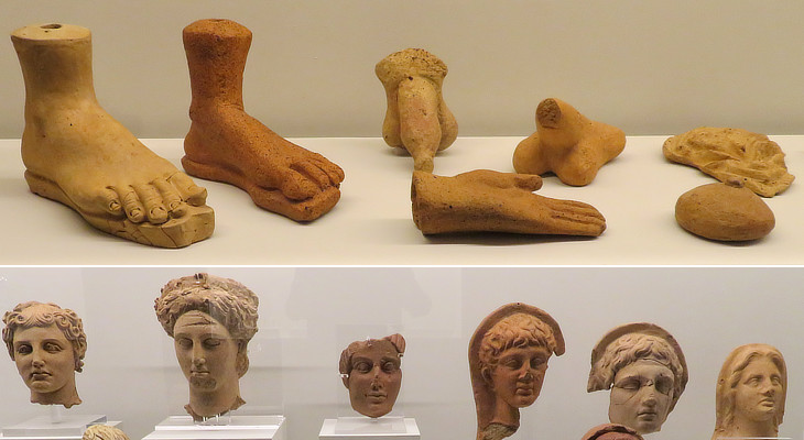 Scuderie del Quirinale: "Tota Italia" exhibition: terracotta ex-votos and portraits of donors from an ancient countryside shrine at a hot spring near Ponte di Nona (see similar ex-votos from an Etruscan shrine)