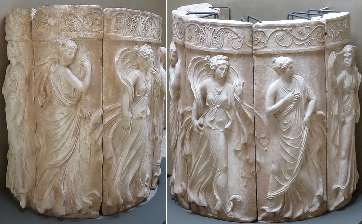 The dancing women are thought to be maenads, i.e. followers of Dionysus, because scenes of Dionysiac processions (thiasos) were very often depicted in sarcophagi. The dancers are not portrayed in isolation in each section of the monument, yet they do not seem to dance in a coordinated manner, which also supports the opinion that they are followers of Dionysus because the god inspired them into a state of ecstatic frenzy. You may wish to see a relief from Sagalassos showing maidens dancing together, each holding the garment of their neighbour.