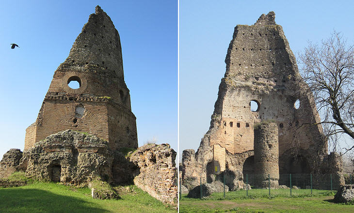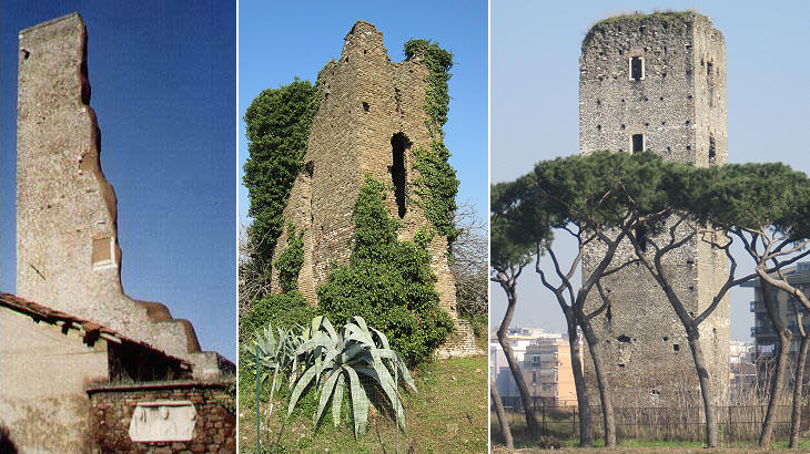 (left) Tor Tre Teste; (centre) a tower built upon a cistern of Acquedotto Alessandrino; (right) Torre di Centocelle, half a mile south of Acquedotto Alessandrino