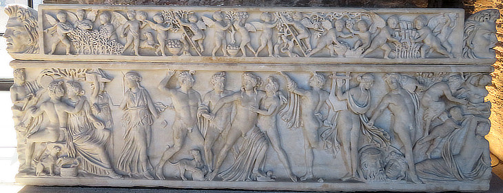 The lid depicts the Four Seasons by portraying Eroses cutting flowers (Spring), picking apples (Winter), grape harvesting (Autumn) and wheat harvesting (Summer). The relief is very finely executed and very lively. The box portrays a drunken Dionysus/Bacchus in a rather theatrical way in the central scene. Dancing satyrs and maenads complete the decoration and to the right Eros discovers Ariadne on the island of Naxos with whom the god will fall in love.