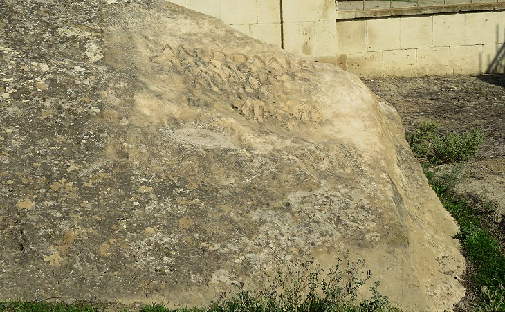 (left) Boulder with carvings at the entrance to the Qobustan National Park at Boyukdash; (right) 1950 inscription stating that no harm should be done to stones having shapes, holes, writings and brands on them
