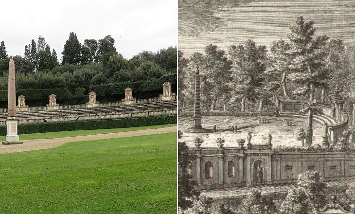 The obelisk was placed at the centre of an existing amphitheatre and it replaced a large group of statues by Giambologna which were moved to embellish a large fountain in another point of the garden. By placing the obelisk at the centre of the amphitheatre the Grand Dukes imitated the example of Villa Mattei.