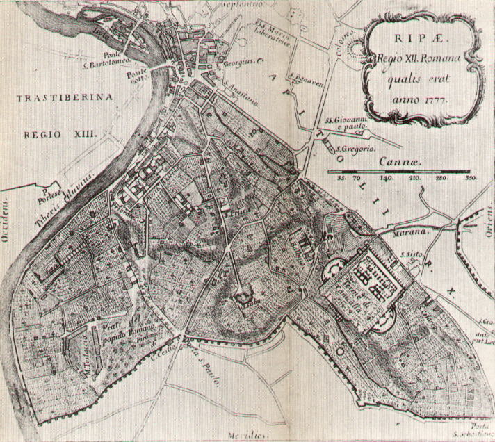 Ripa (in today's Italian riva) means river bank and Rione Ripa includes the area on the left bank of the Tiber from Isola Tiberina to the walls surrounding Monte Testaccio. In addition to the river bank it includes the Aventine hill. It borders to the north on S. Angelo, to the east on Campitelli, to the south on the walls of Rome and to the west on the river. In the XVIIIth century only the very northern part of the rione was populated while the rest of it was split into villas and farms.