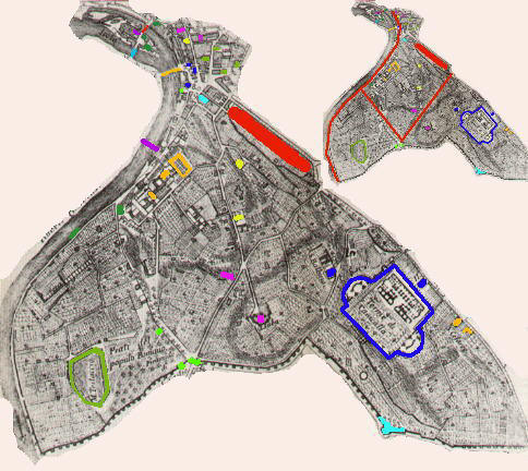The different colours group the monuments which are shown in the same page (because of the scale of the map a few minor monuments were omitted).