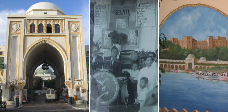 (left) Entrance to the Agora; (centre) a photo taken in the 1920s at a cafè of the Agora; (right) the most sold postcard of Rhodes: the Agora and the Palace of the Grand Masters