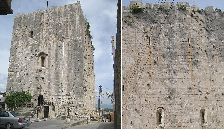 It is thought that one of the reasons for building such a tall tower was to allow visual communication with Marqab and Krak des Chevaliers, another castle in the County of Tripoli. Today the tower is surrounded by a small town housing a large community of Christian Arabs (mainly Maronites or belonging to the Syro or Greek Orthodox Churches), but it is still a landmark which can be detected from a great distance.