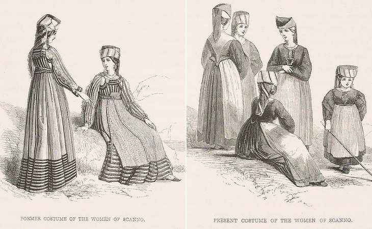 In former days, the material of the Scannese dress was scarlet cloth richly ornamented with green velvet, gold lace, &c., the shoes of worked blue satin, and the shoulder-strap s of massive silver, a luxury of vestments now only possessed by a very few. At present, both the skirt and boddice are of black or dark-blue cloth, the former being extremely full, and the waist very short; the apron is of scarlet or crimson stuff. The head-dress is very striking: a white handkerchief is surmounted by a falling cap of dark cloth, among the poorer orders; but of worked purple satin with the rich, and this again is bound round, turbanwise, by a white or primrose-coloured fillet, striped with various colours, though, excepting on festa days, the poor do not wear this additional band.The hair is plaited very beautifully with riband; and the ear-rings, buttons, neck-laces, and chains are of silver, and in rich families, often exceedingly costly.