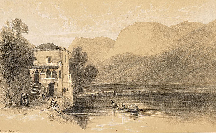 September 8th and 9th, 1843. Scanno is an exceedingly cold place, and in winter is surrounded by snow for many months; the air is very pure and healthy. Nothing appears certainly known of the origin of the town, (..) it may have been called Sanno, from its having had a Samnite origin. It is more natural to suppose that it was from the union of several colonies from various parts during the turbulent times of the twelfth and thirteenth centuries, and to this the armorial insignia of the town - a cluster of castles, gives great probability. It contains about three thousand inhabitants. After drawing at the Lake, I returned to a fésta of the Madonna, which was more worth seeing than any I ever witnessed in Italy, on account of the procession of all the women of the place in their Gala dresses; and the display of beauty was really extraordinary. At dinner, the day being Friday, tench, barbel, and bream, were the only fare: the silent sister said "Prosit," as before; and the uncle would talk about that horrid Tunnel. In the afternoon, after I had finished my drawing, I rode on a good horse with Don ---; there is splendid scenery about Scanno, and I suspect the pass to Castel di Sangro would be worth exploring.