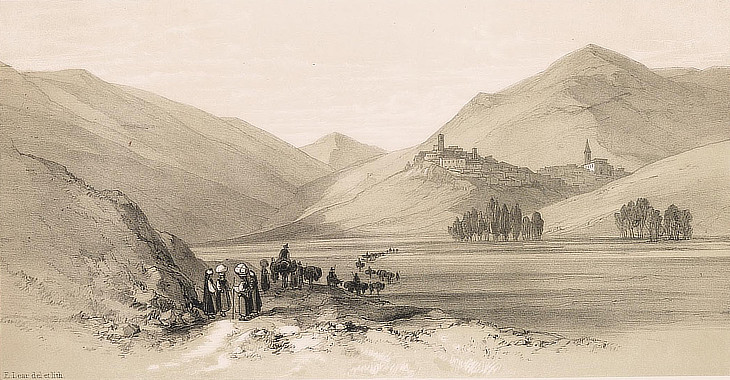Scanno burst on the view in all their dreary majesty; no vegetation; no break in the hills to charm the eye with some milder scene beyond, but towering walls of bare rock, shivered into ravines, or formed by nature into gigantic buttresses, crowned with light gray crags and points against the dark-blue sky, and surrounding a long plain fully as barren as its confines. As I looked down on the desolate scene below me, a winding path among the