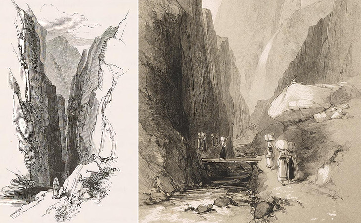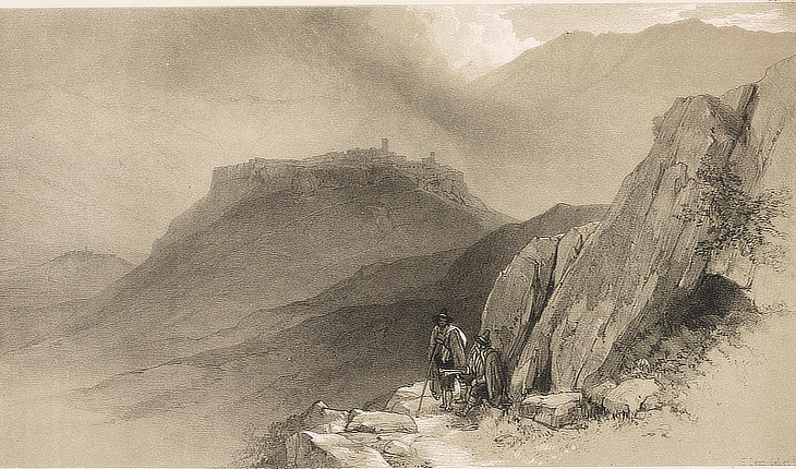 September 13th, 1843. Drew much at the mouth of the pass; a scene so majestic that much time might be spent in doing it justice. As I sat below a huge rock, on which a little goat-herd was piping to his scattered charge, the sound of a chorus of many voices gradually roused the echoes of the mighty walls: a most simple and oft-repeated air, slowly chanted by long files of pilgrims, mostly women of Castel di Sangro, (perhaps fifty in number); they were on their way to the shrine of S. Domenico, in Cocullo, and came in succession down the winding path, carrying large bales of different coloured cloths on their heads, and walking with long sticks. Such little incidents are sought for in vain by the high-road traveller. Long after the last of the pilgrims had disappeared, the notes rang at intervals through the hollow, and then all was left to its own gloomy silence.