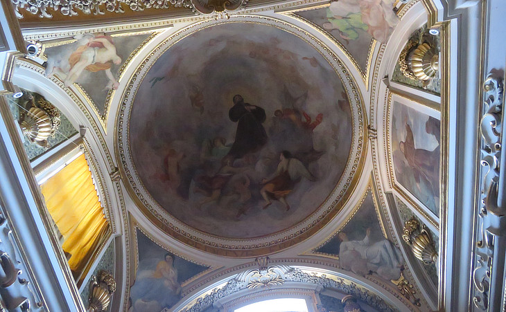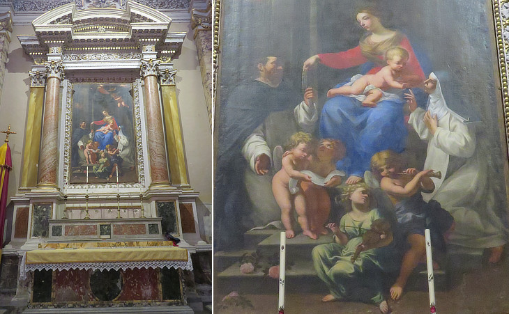 (left) Altar of the Rosary: (right) The Virgin Mary handing the rosary over to St. Dominic at the presence of St. Catherine of Siena and of four playing and singing small cherubs, attributed to Pietro da Cortona (see some putti which he painted at Palazzo Pitti)