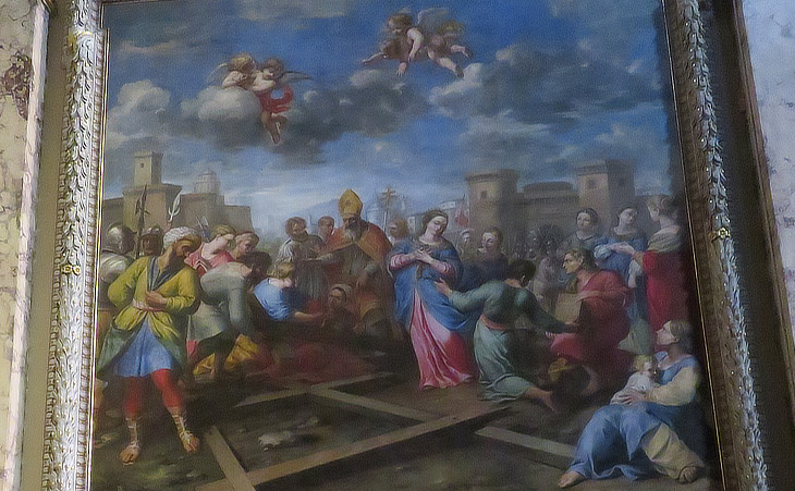 Today the historical attribution of the altarpiece to Pietro da Cortona, in the lack of specific records, is generally disregarded and art historians suggest the hand of a good pupil of Carlo Maratta, the leading painter in late XVIIth century Rome. See a painting of the late XVIth century depicting the same subject in a church at Sant'Oreste and one by Carlo Maratta in Palermo.