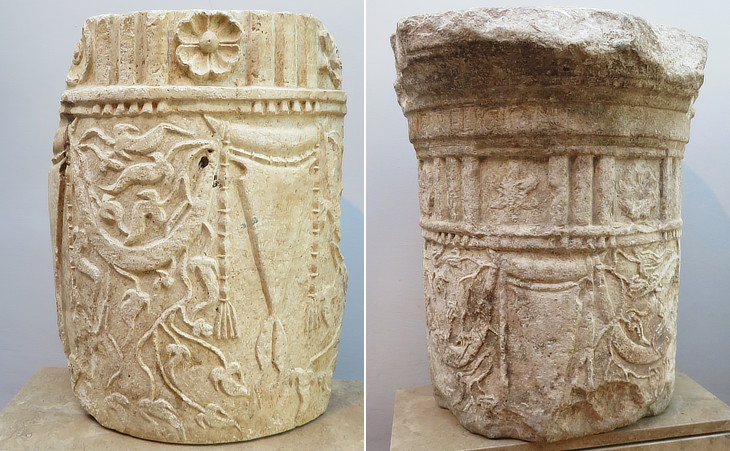 The altars were used as wellheads which explains why they survived to our days; the inscription on one of them most likely indicated that it did not have a religious significance any longer. Their body is decorated with festoons (see a round altar at the Republican temples of Torre Argentina), plants and stylized bucrania (ox skulls) which were often depicted on altars (e.g. one at Musei Capitolini) and funerary monuments (e.g. Tomba di Cecilia Metella).