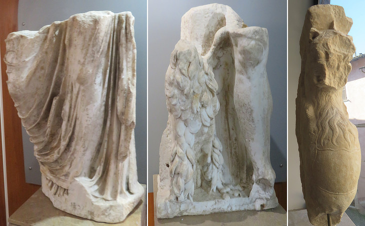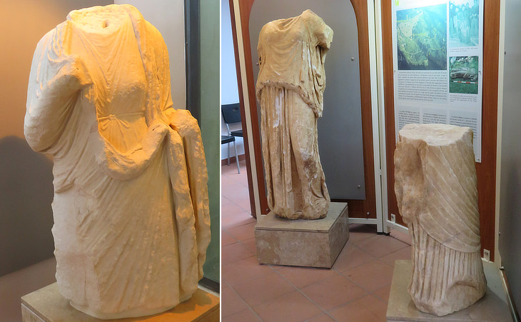 Other Roman statues which were found at Steccato outside Porta Foca: (left) funerary female statue in white marble, of excellent workmanship. The figure, without the head and the lower part of the legs, wears a dress tied at the waist with a knot and has the body wrapped in a thin cloak. It is perhaps an allegory of Modesty, a typical virtue of Roman matrons; (right) statue representing a female figure wearing a Doric peplos with subtle transparencies (based on models developed in Greece in the Vth century BC) and fragment of the lower part of a female statue, standing on the left leg and with the right leg slightly retracted and bent