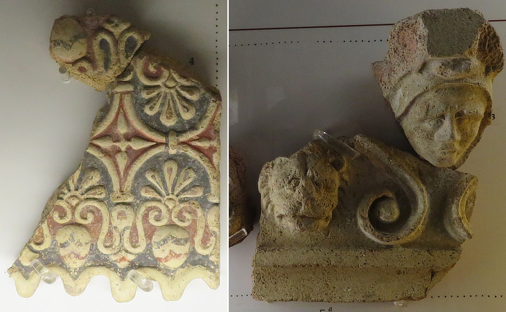 Terracotta decorations of temples: (left) early Vth century BC cladding slab decorated with palmettes and lotus flowers from the Temple of Juno Moneta; (right) heads of lions and warriors (IInd century BC)