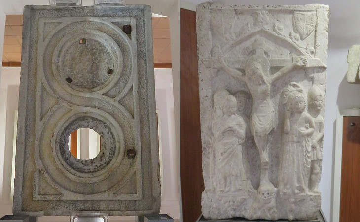 Medieval exhibits: (left) slab which was decorated with Cosmati work and placed in the Cathedral; (right) Crucifixion (XIVth century) which was sculptured in a Roman altar