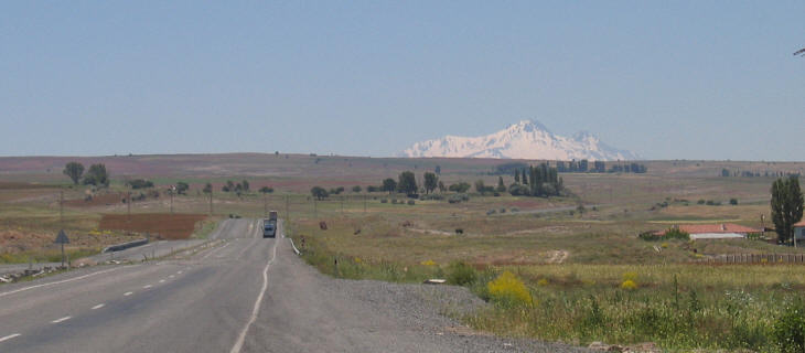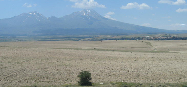 View of the countryside between Sultanhan and Kayseri; in the distance Mt. Argaeus 13,124 ft. (Erciyes Dagi)