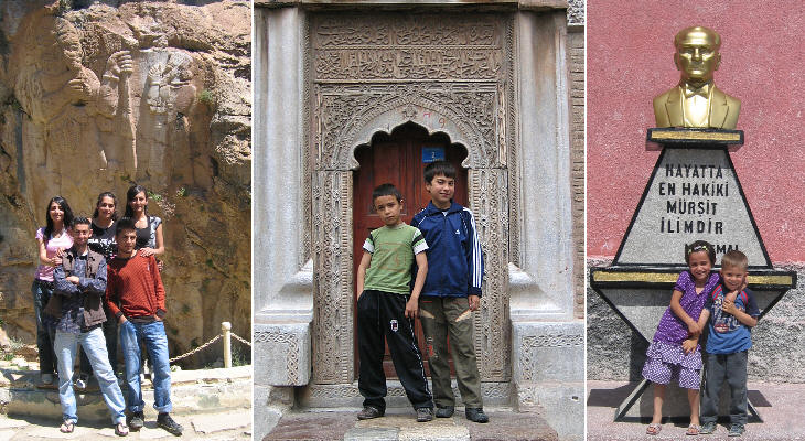 Posing for romeartlover at Ivriz (left - Hittite relief); Konya (centre - Hasbey dar ul Huffaz ); Bor (right - statue of Kemal Ataturk in the courtyard of a primary school)