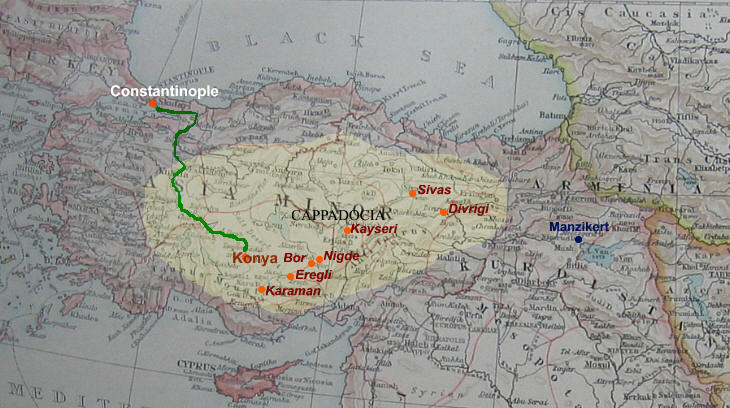 Clickable map of the towns covered in this section. The lighter area shows the approximate borders of the Sultanate of Rum. The green line indicates the 1896 railway linking the Asian side of Constantinople with Konya - the first leg of the Constantinople - Baghdad Railway (1900 Times Atlas of the World)