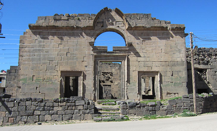 On the north side of the village are the ruins of what was once an elegant structure; but nothing now remains except a part of the front, and some arches in the interior. It is thirty paces in length, with a flight of steps, of the whole length of the building, leading up to it. The entrance is through a large door whose sides and architrave are richly sculptured. On each side is a smaller door, between which and the great door are two niches supported by Ionic pilasters, the whole finely worked. Burckhardt