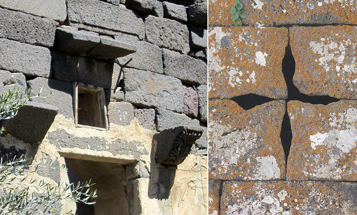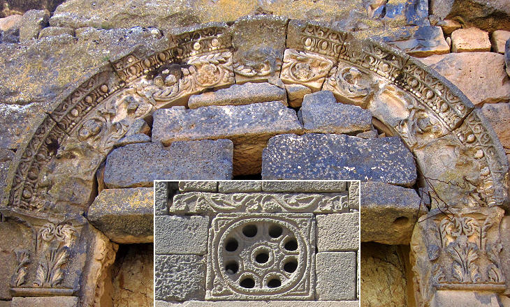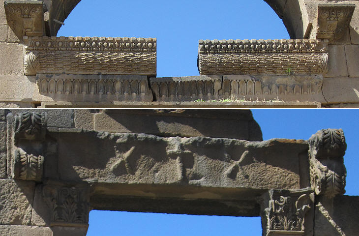 (above) Lintel of the main entrance; (below) a modified lintel with Christian symbols