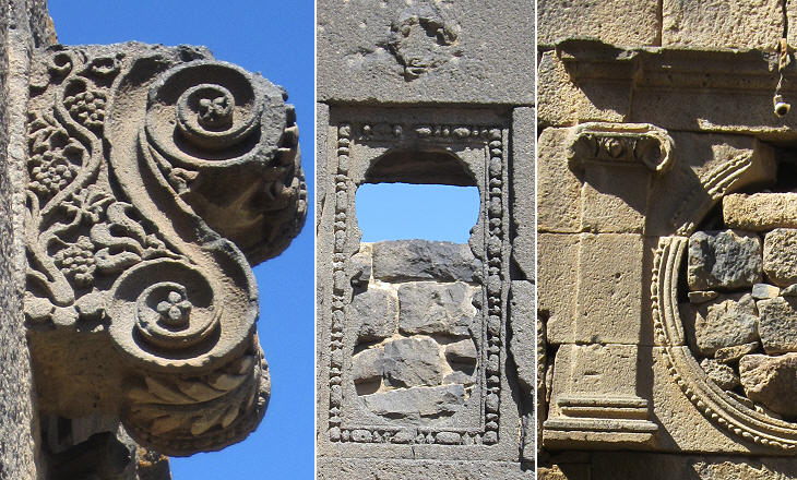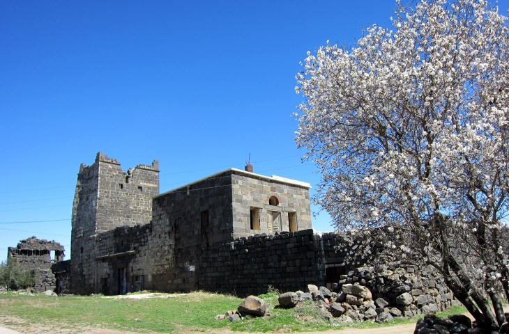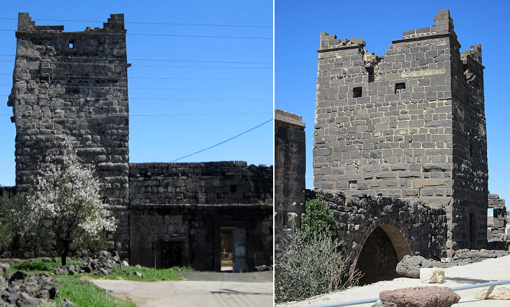 The massive tower allowed the early detection of Bedouin tribes approaching the town from the desert behind the mountains; at Shahba, similar to the other Roman towns of the regions, buildings have the black colour of the basalt stone which was employed in their construction.