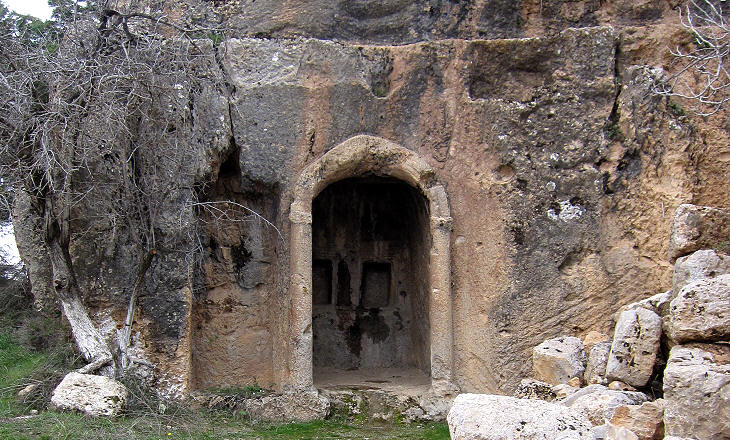 (left) Entrance of a former Roman tomb which now serves as meeting hall for the Druze community (see also the image in the background of this page); (right) a cross-shaped opening in the rear wall of the tomb