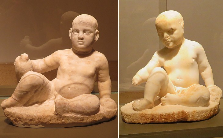 Eshmun was associated to Apollo and eventually to Asclepius, Apollo's son and the Greek god of medicine. The statues shown above were donated to call for the protection of the god's healing powers. The children were portrayed in a realistic way while playing with a toy or a bird.