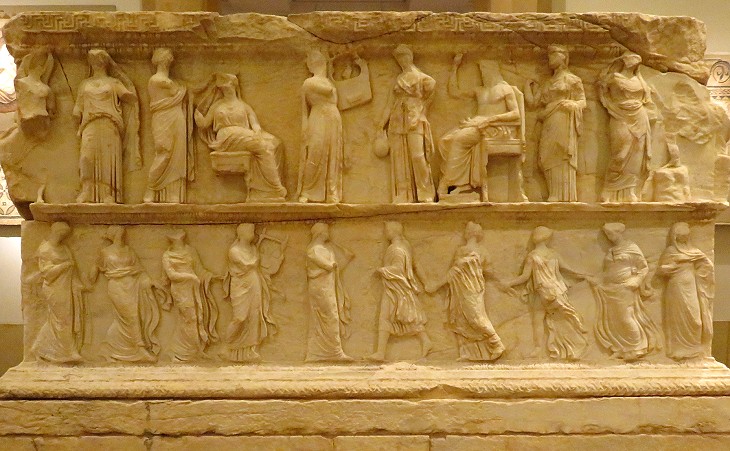 National Museum of Beirut: "tribune", perhaps a rectangular altar, from the Temple to Eshmun: upper relief: Apollo, Athena and Zeus and other goddesses; lower relief: dancers and instrument players, a sort of early Dionysiac procession