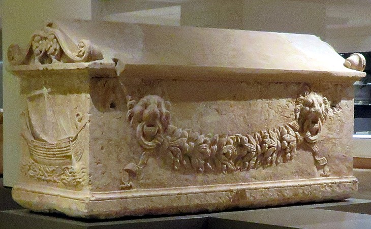 This sarcophagus has become a symbol of the maritime importance of Sidon and of Phoenicia, but it was not actually made at the heyday of the city's success, but when it was part of the Roman Empire. The relief on the short side of the box depicts a navis oneraria (merchant vessel), similar to those which can be seen in floor mosaics at Ostia and in a relief from Porto.