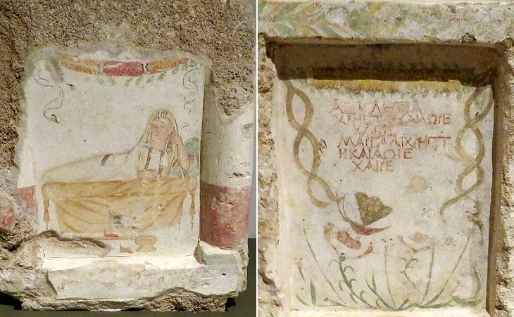 In 1940 an entirely painted hypogeum (underground tomb) was found near Tyre and it was reconstructed inside the Museum of Beirut, which houses also a number of limestone painted stelae from Sidon. That portraying a woman at her funerary banquet is a cheap version of a popular sarcophagus relief; the other one is less common: it shows a butterfly leaving the chrysalis, a reference to the soul leaving the body; the choice of this subject is perhaps explained by the inscription which says that the dead passed away prematurely. See a sarcophagus at Arles which depicts Psyche with her butterfly wings.