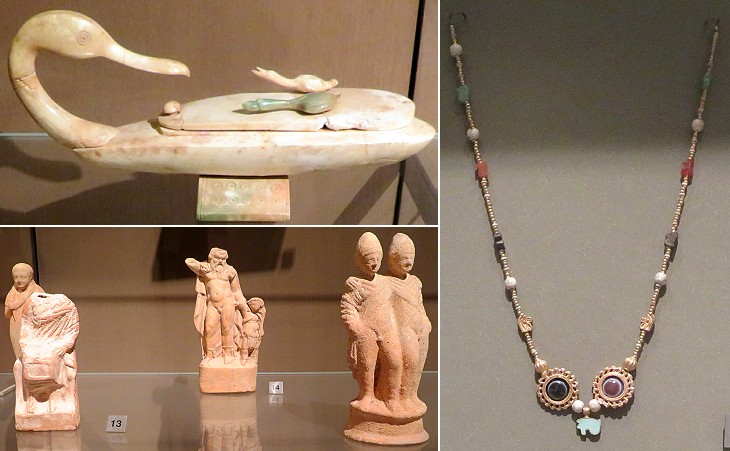 National Museum of Beirut: other exhibits from Sidon: (left-above) Pre-Roman period ivory box; (left-below) Vth century BC terracotta figurines; (right) Late Bronze Age necklace. In the introductory page you can see a statue in Egyptian attire, a mosaic on the lid of a sarcophagus and a relief depicting Mithra, all from Sidon