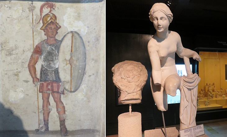 Archaeological Museum of Istanbul: exhibits from Sidon: (left) painted stela (IInd century BC); (right) small statue of Aphrodite removing her sandal (IInd century AD); see another exhibit from Sidon at Istanbul