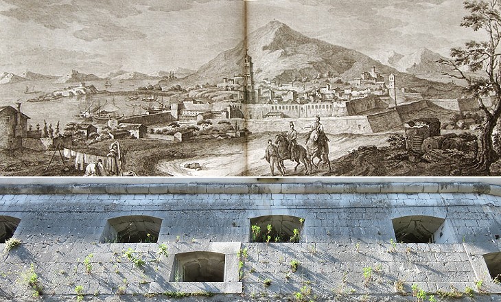 (above) View of Spalato from Gripe by R. Adam showing the two enclosures of the town; (below) modern artillery openings in the northern side of the fortress