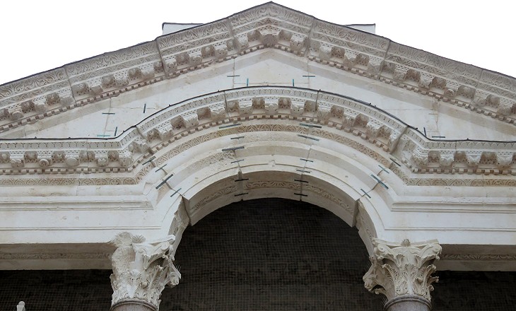 The decoration of the portal is indicative of the changes in art which began to occur at the time of Diocletian and became more evident during that of Emperor Constantine. Putti working in a vineyard and the depiction of birds are motifs which can be found in many buildings of the Late Empire and in particular at S. Costanza in Rome. The use of drill in reliefs is another change worth mentioning.