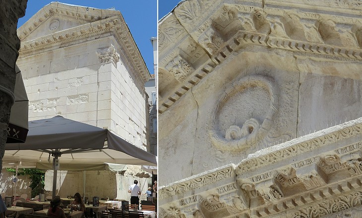 Maybe the groups of people Robert Adam portrayed in his etching were not actually there when he visited Spalato in July 1757 and were added to make the view more picturesque. The heart of the palace is a small peristyle (a colonnaded courtyard) at the end of a now lost street which began at Porta Aurea. The entrance to the Emperor's apartments was preceded by a sort of triumphal arch known as Serliana (three smaller Serliana decorated the waterfront side of the palace). Two temples were accessed through the long sides of the Peristyle: to the left a large octagonal building which is believed to have been the Emperor's mausoleum (see a page on it) and to the right a small traditional temple that is covered in this page.