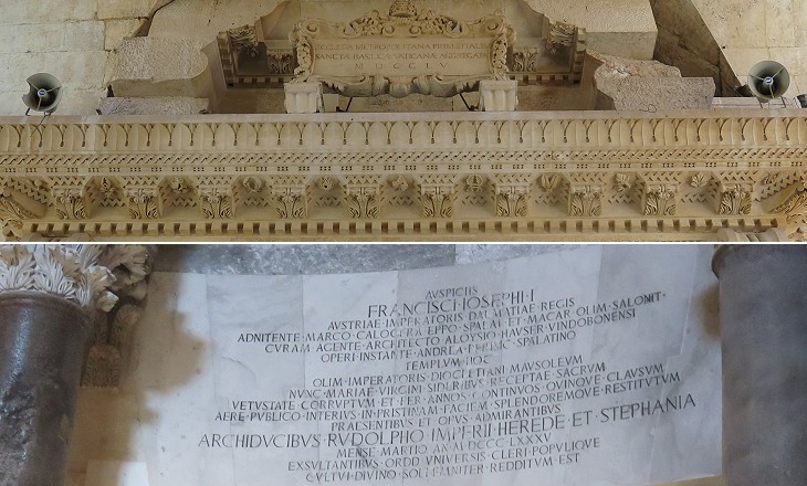 Cathedral: (above) 1755 inscription above the portal saying that the Diocese of Spalato was a Primatial See (it was in the interior of the church until 1885); (below) inscription celebrating the Austrian restoration of the interior. The inauguration in March 1885 was attended by Crown Prince Rudolph and his wife Stéphanie