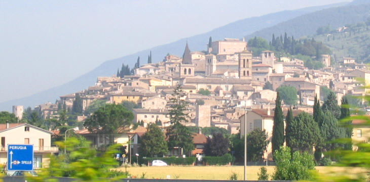 SpelloThe train leaves Foligno and heads north; in a few minutes it reaches Spello which is located on a low hill at the foot of Monte Subasio.