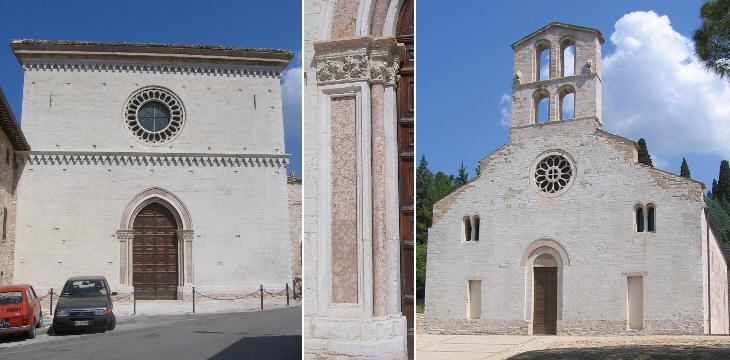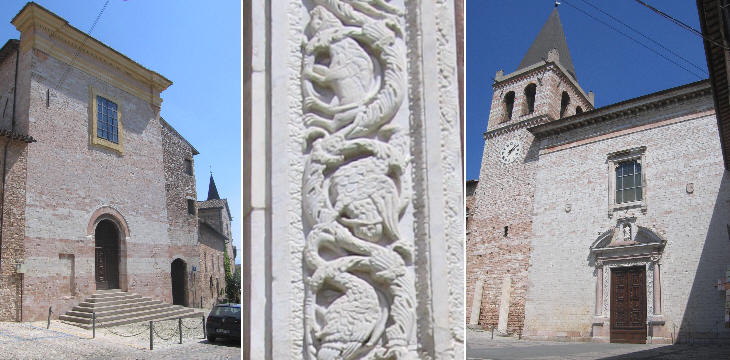 The churches of Spello, similar to those of Foligno and Assisi are characterized by the use of white and pink stones. The image used as background for this page shows the white and pink decoration of the portal of another church (S. Lorenzo) showing a very elaborate use of these stones.