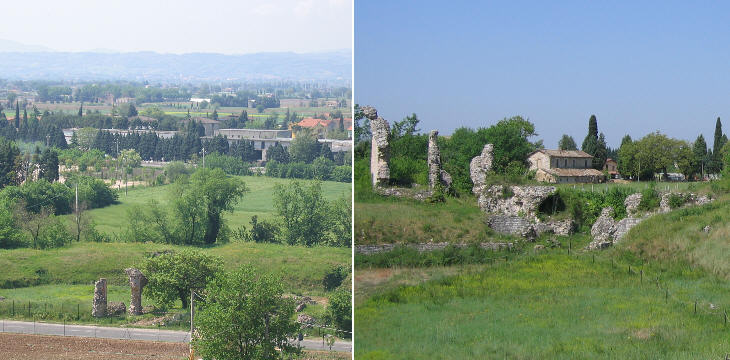 (left) The site of the Roman amphitheatre and in the far distance Bevagna: (right) ruins of the amphitheatre