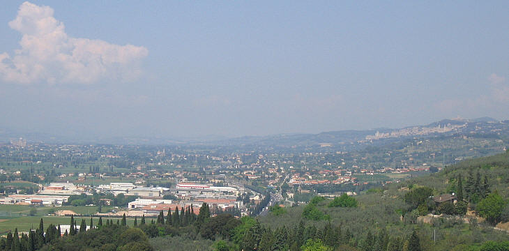 View towards Assisi (on the hill to the right) and S. Maria degli Angeli (far left in the plain)
