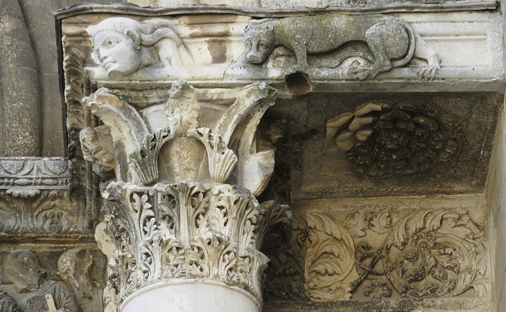 The general design shows the same delicate sense of proportion in the disposition of the ornament. The ornaments of the Roman mouldings at both churches are based on the Roman antique; in both (..) the pilasters are fluted, a feature belonging to the west and not to the east, and the scrolls are purely Latin and have nothing Byzantine about them. The capitals in particular are based on Roman Corinthian, with deeply channelled folds and pipings, and rounded raffling, quite unlike the sharp crisp acanthus, and the flat surface treatment of the Byzantine school. Many of them contain figures of birds and animals admirably posed, and at S. Gilles, along the edge of the architrave that runs under the frieze, is a series of little animals - lions, dogs, and whelps of various kinds - carved with life and spirit that it would be hard to surpass. Jackson
