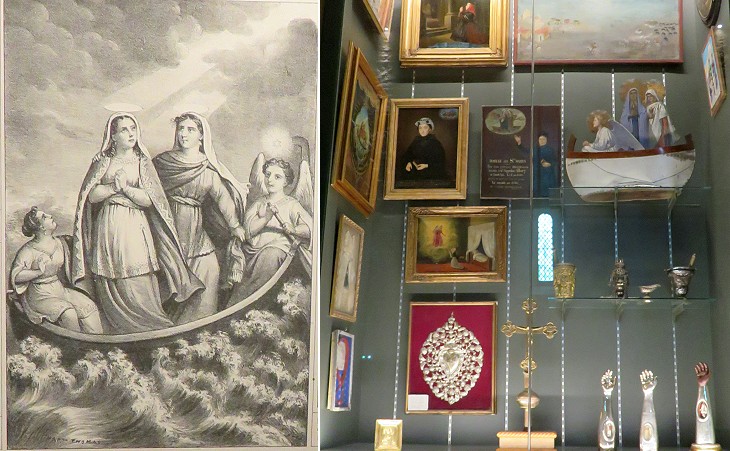 (left) Musée de la Camargue: XIXth century engraving showing the two Marys and Sarah: (right) ex votos at Notre-Dame-de-la-Mer