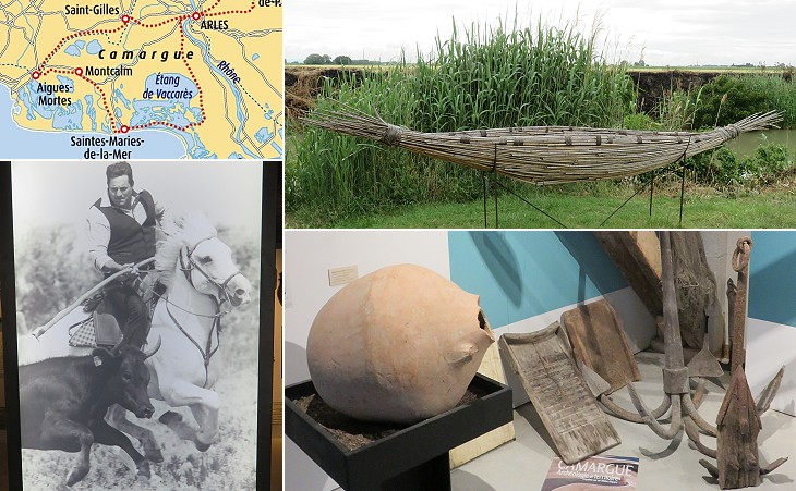 (left-above) Map of the Environs of Arles; all others: exhibits from Musée de la Camargue on the road between Arles and Saintes-Maries-de-la-Mer