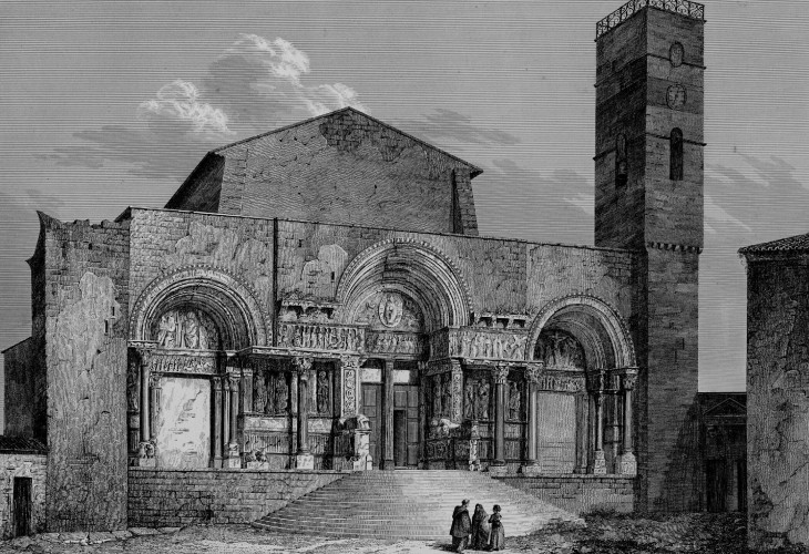 St Gilles is a town of antiquity originally Rhoda Rhodiorum, a colony founded by the Rhodians according to Pliny, situated on the Petit Rhone, chiefly remarkable at present for its magnificent abbey church which will interest the antiquary. The upper church was begun 1116 on a scale of great magnificence by Alphonso, son of Raymond IV, Count of St Gilles, called Jourdain because baptised in the Jordan, but was destroyed during the wars of religion having been turned into a fortress by the Huguenots in 1562 and demolished when no longer tenable as such by the Duc de Rohan in 1622. It has been replaced by a temporary structure of late date and inferior architecture. The West Front is a masterpiece of the Romanesque style upon which every species of ornamental decoration and rich sculpture seems to have been lavished. It has been described as one immense bas relief crowded with pillars, statues, panelling, foliage combined with a strange infusion of the elements of classical architecture, columns, capitals, entablatures and friezes. Sculptured lions are frequently introduced as supports to the pillars and in other parts and as the abbots of St Gilles, powerful seigneurs in ancient days, used to sit at the gate of the church to dispense justice, many of the old charters begin with the words "Domino NN sedente inter leones". Murray