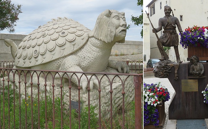 (left) 2005 Statue of the Tarasque by Pascal Demaumont; you may wish to see an ancient statue in the Lapidary Museum of Avignon which depicts a river monster; (right) Monument to Tartarin of Tarascon, the hero of a novel by Alphonse Daudet