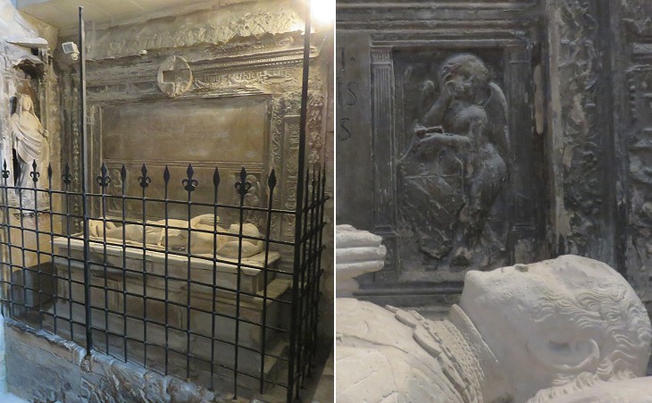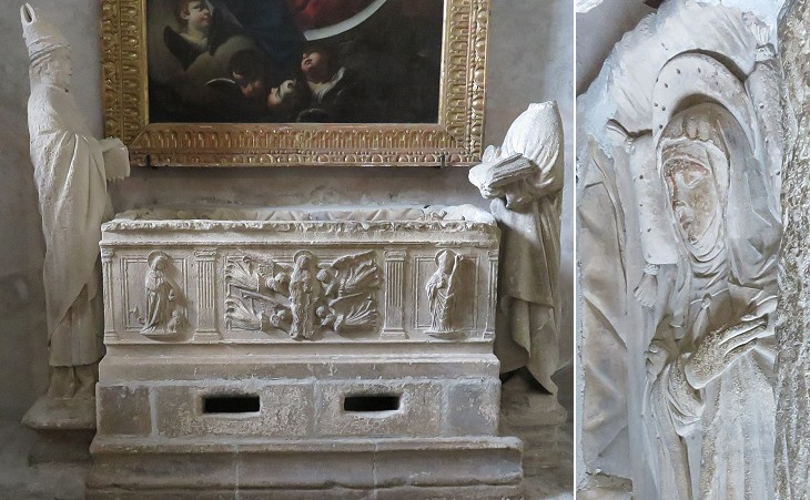 The tomb was made in 1458 at the initiative of King René. The statue to the left portrays St. Lazarus, brother of Martha, who became the first Bishop of Marseille (but at Larnaca they tell a different story). He is portrayed also on the box of the sarcophagus which shows also St. Mary Magdalene carried to Heaven by four angels and St. Martha with the tarasque (see a statue of the saint with the tarasque at S. Silvestro in Capite in Rome).