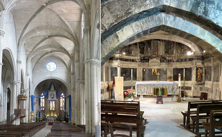 Collegiale Royale Sainte-Marthe: (left) interior with blue ribbons celebrating the 2016 Extraordinary Jubilee Year of Mercy; (right) crypt with Roman sarcophagus