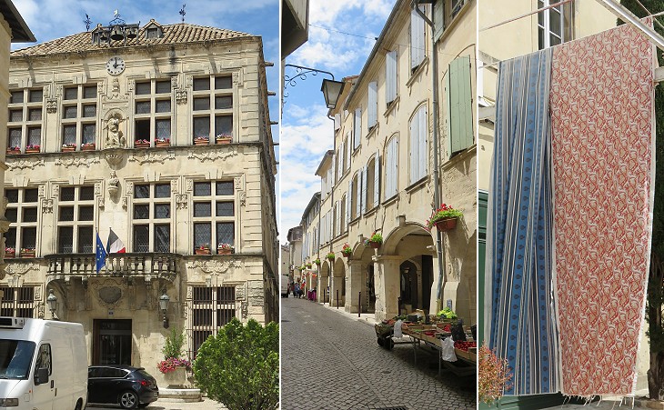 A white stone characterizes many of its buildings and long porticoes protect the passer-by from Mistral, a cold north-westerly wind. Here and there some locations are decorated with Indiennes, printed cotton textiles with bright colours. They were made by a factory which was founded in 1806 at Tarascon.